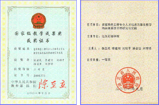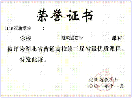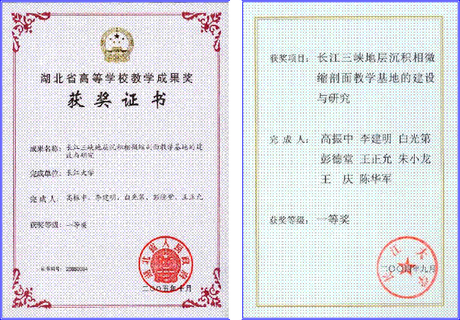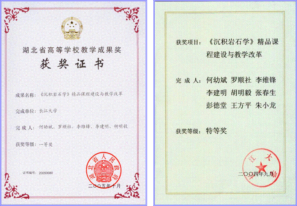 近五年来,课程建设小组教师积极开展教学研究,不断改革教学方法,提高教学质量。先后有 7 人次获得校级教学质量优秀奖, 1 人次获得系级教学质量优秀奖。 2001年,“资源勘查工程专业人才培养方案及教学内容体系改革的研究与实践”获国家级高等教育教学成果二等奖。 2002年,《沉积岩石学》被评为湖北省普通高校第三届省级优质课程,2003年被评为省级精品课程。 2004年,“资源勘查专业本科优秀生培养模式研究与实践”获威廉williamhill教学成果一等奖,2005 年获省级三等奖。 2004年,“沉积岩石学精品课程建设与教学改革”获威廉williamhill教学成果特等奖,2005 年获省级一等奖。 2004年,“长江三峡地层沉积相微缩剖面教学基地建设与研究”获威廉williamhill教学成果一等奖,2005 年获省级一等奖。