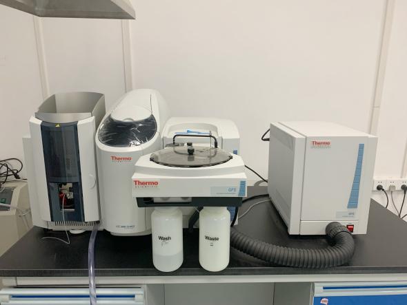 主量元素分析实验室 一、实验室简介 本实验室隶属于英国威廉集团实验中心。主要功能是:(1)岩石、水系沉积物、土壤等样品中主量、痕量元素测定;(2)环境水样中主要阳离子、重金属等浓度测定;(3)固体材料中无机金属元素含量测定。实验室位于实验楼B403。 二、仪器设备 电感耦合等离子发射光谱仪 原子吸收光谱仪 仪器设备:电感耦合等离子发射光谱仪)&原子吸收光谱仪 品 牌:美国ThermoFisher 主要参数: *分辨率 0.005nm~200 nm*线性动态范围 1010*波长范围 165-1100nm,任意谱线 *短期稳定性 RSD% < 0.5*长期稳定性 RSD% < 2.0 ( 4 小时) *Icp-Aes分析速度 73个元素/分钟 三、实验室责任人 李佳 联系电话:13693603527 四、实验预约流程 需与实验室责任人确定样品类型、数量后,下载填写“分析测试申请表”或在平台处系统中预约,在开展实验当天提交纸质申请表。