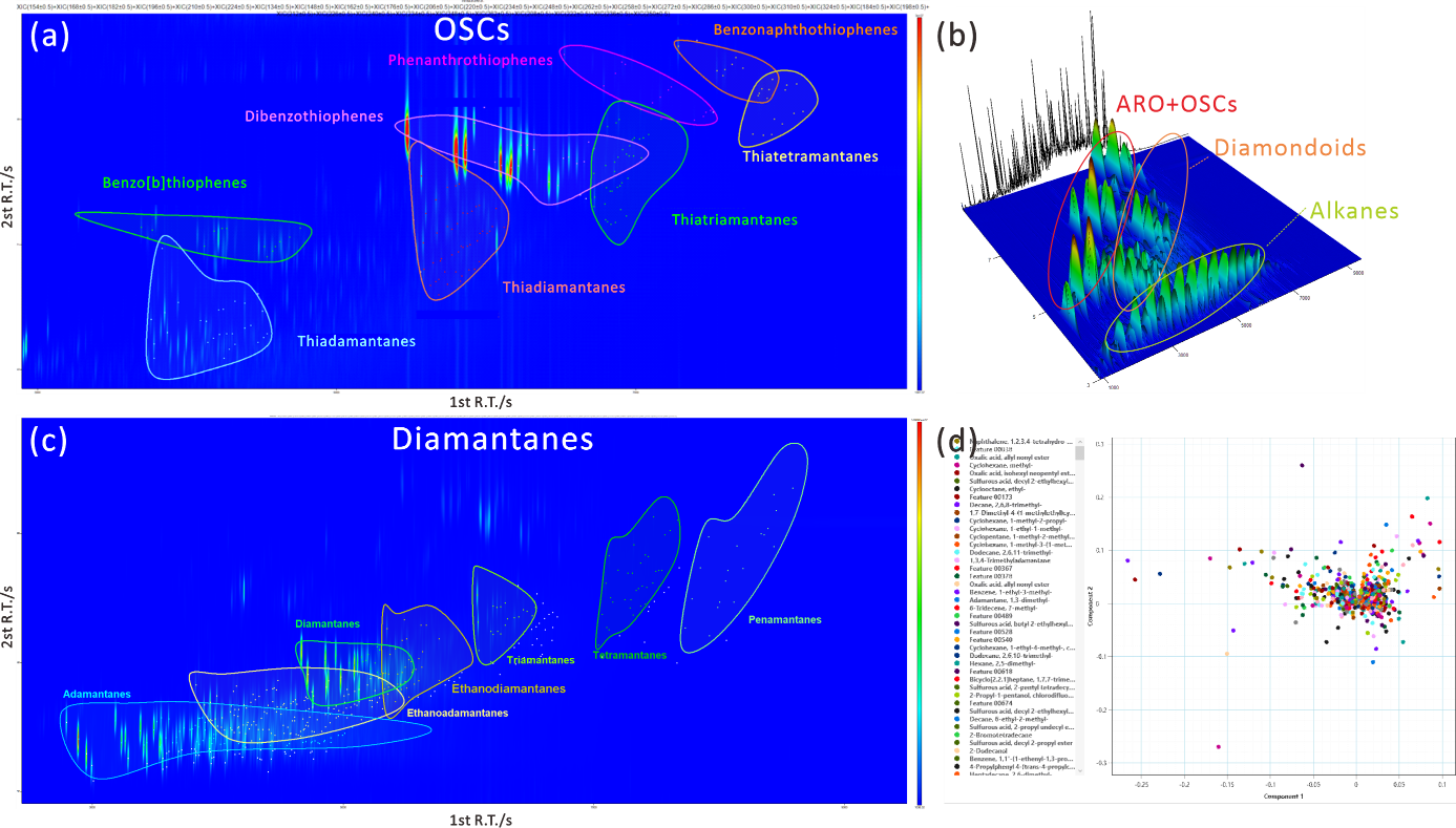 GC×GC-TOFMS检出原油中不同分子标志物指纹特征及油对比组学分析。(a)有机含硫化合物;(b)金刚系列;(c)总离子流三维图;(dPCA组学对比