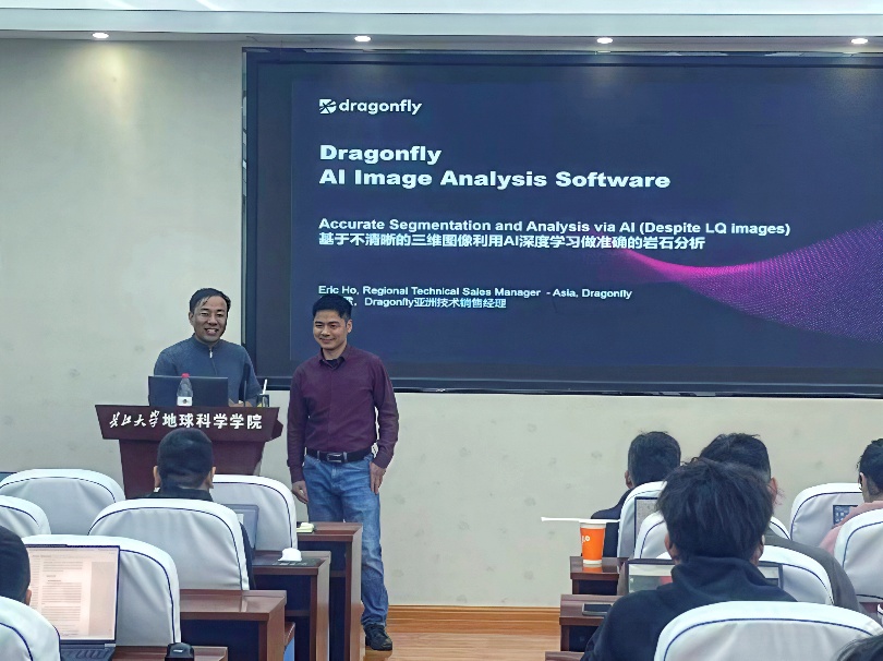 报告中,何沛霖经理系统介绍了Dragonfly软件在岩石图像处理与分析中的前沿应用。他重点阐述了如何借助该平台调用预训练的人工智能模型,实现对CT与EM图像中孔隙结构的自动识别与分割,并进一步应用于多孔介质的量化分析与表征,为相关领域研究提供了高效、可靠的技术路径。