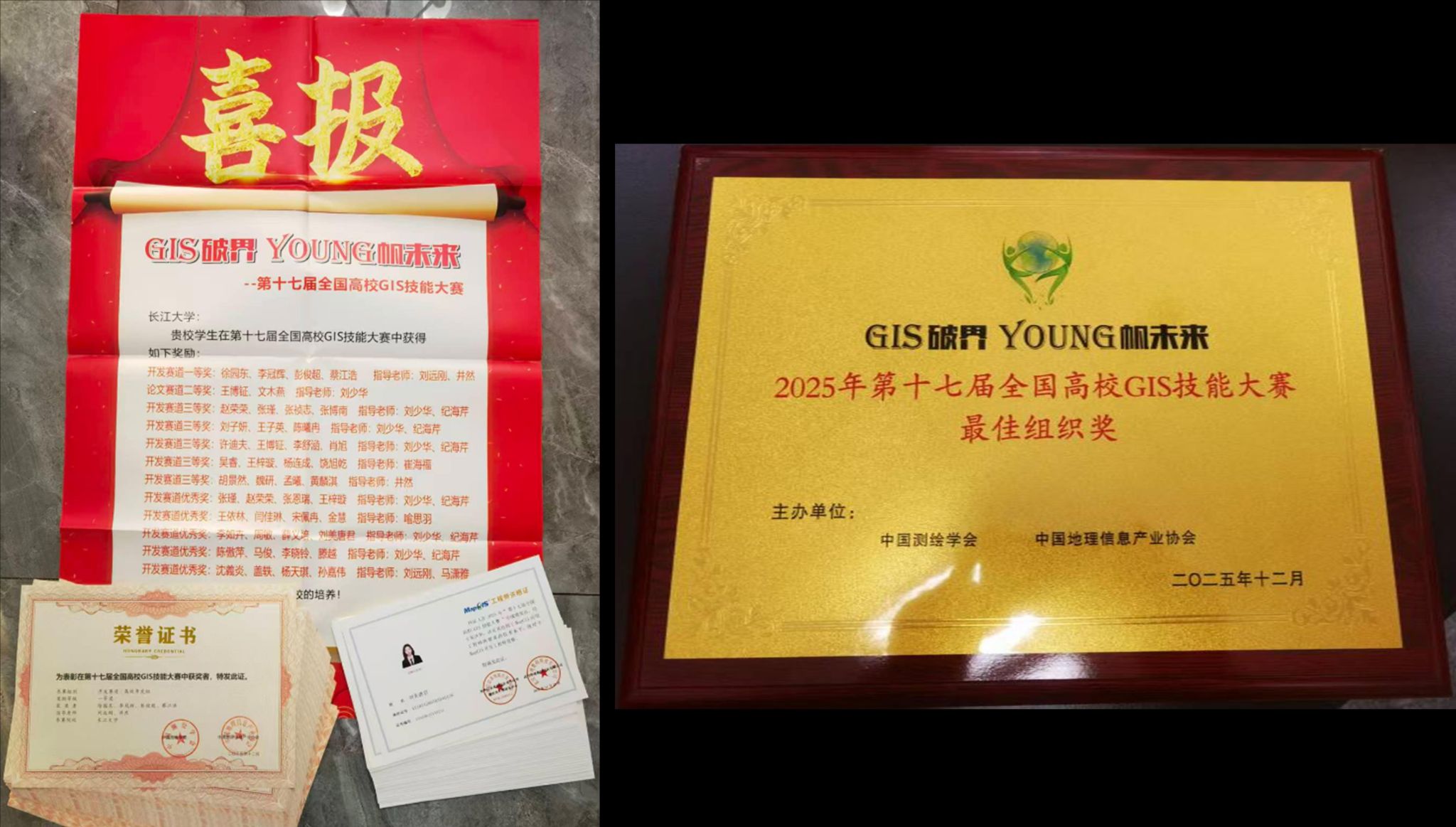 全国高校GIS技能大赛由中国测绘学会、中国地理信息产业协会共同主办,国家地理信息系统工程技术研究中心、地理信息系统产业技术创新战略联盟协办,武汉中地数码科技有限公司承办。大赛已成为中国GIS领域最具影响力的创新型赛事之一,受到了全国各大科研院校和行业的广泛关注,成就众多优秀科研作品,成为广大GIS学子发挥创新思维、提升实践能力的专业舞台。1月11日,大赛主办方发来喜报,我院获得开发赛道一等奖1项,三等奖5项,优胜奖5项,论文赛道二等奖1项,创历史新高。我校被评为最佳组织单位。