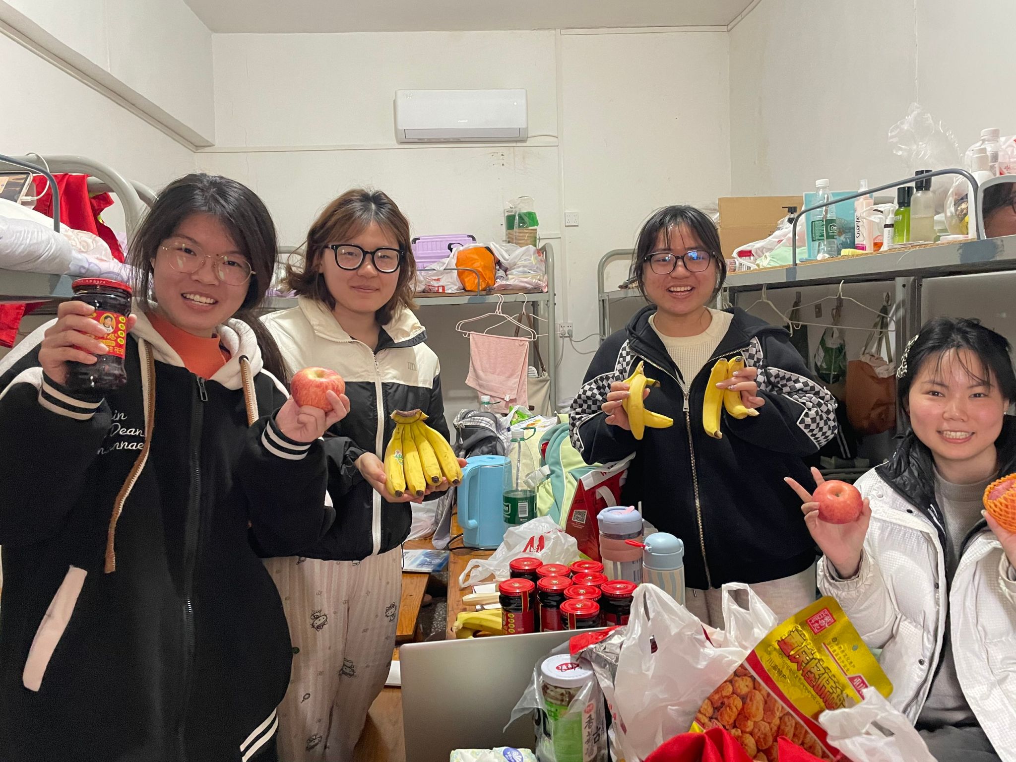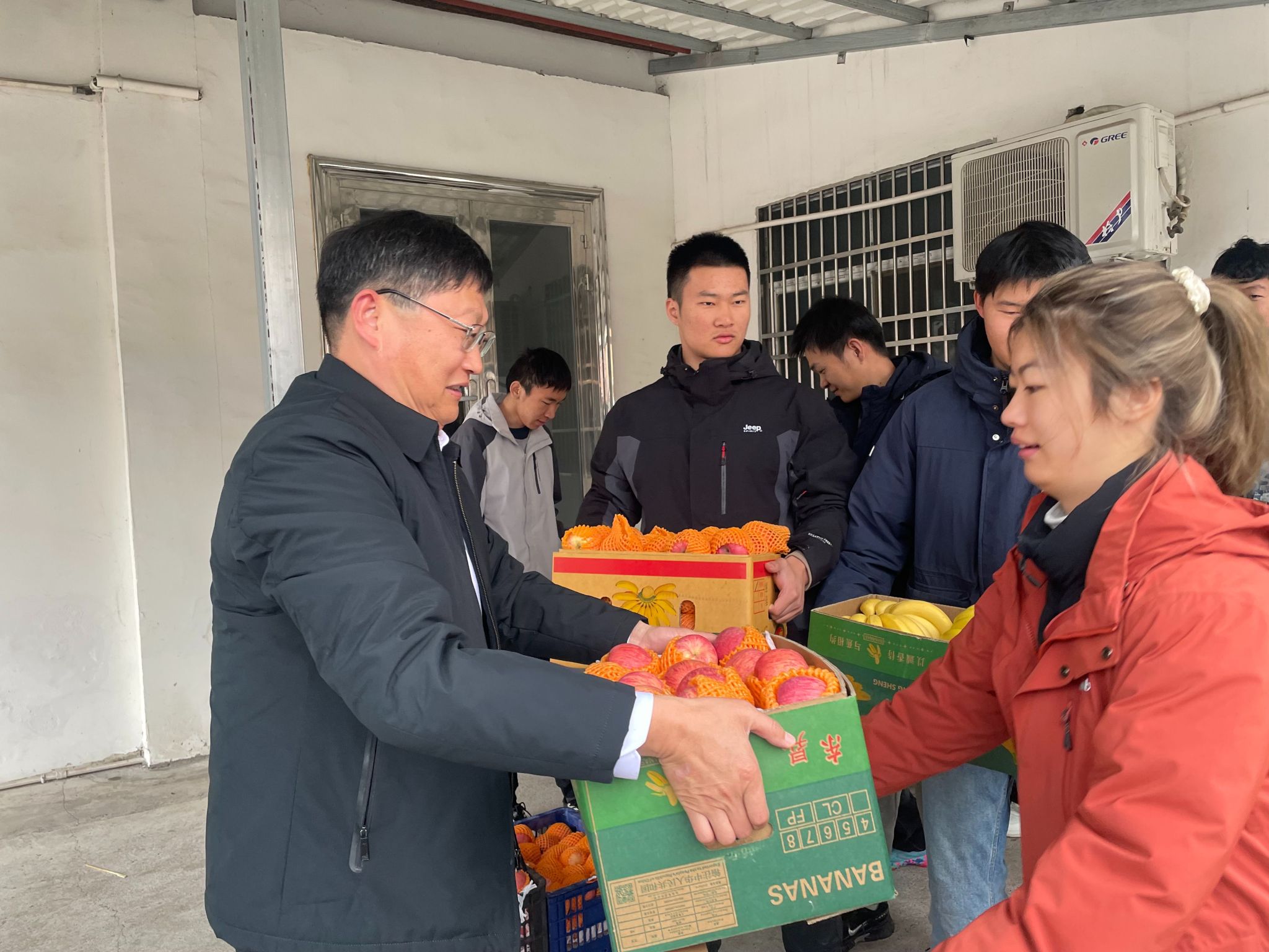 在实习队驻地,院领导一行为师生们送上精心准备的慰问品——红彤彤的苹果和金灿灿的香蕉,还有部分生活物资。当一箱箱水果搬下车时,同学们发出惊喜的欢呼。“这是‘苹’安,这是‘蕉’踏实地,祝大家实习顺利!”党委副书记冯舒幽默的祝福引得大家笑声一片。