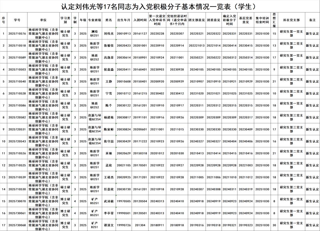 通过对2025级新生入党积极分子档案材料审查,17名同学符合条件且入党材料齐全,现将其编入党支部,安排参加组织生活,加强教育管理,进一步增强党性观念和组织观念,发挥其先锋模范作用。认定 刘伟光 17 名同志为入党积极分子,现予以公示。公示时间: 2025 9 24 日至 2025 9 30日。