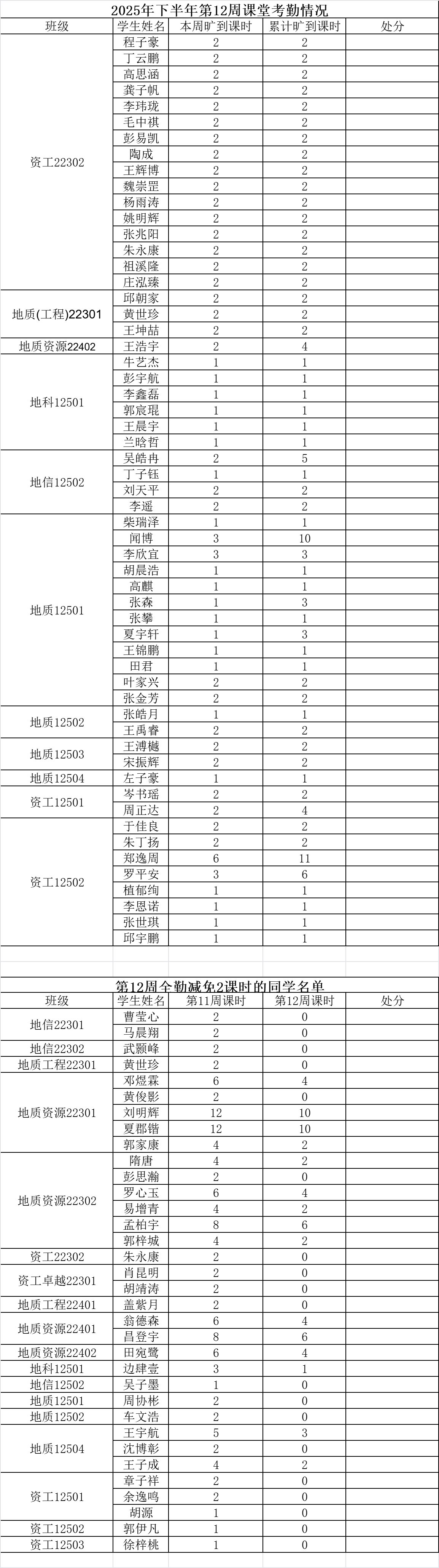 为落实学院关于加强学风建设的相关要求,进一步规范课堂秩序,营造良好的学习氛围,我院持续开展常态化课堂考勤工作。现将第十二周考勤情况通报如下: