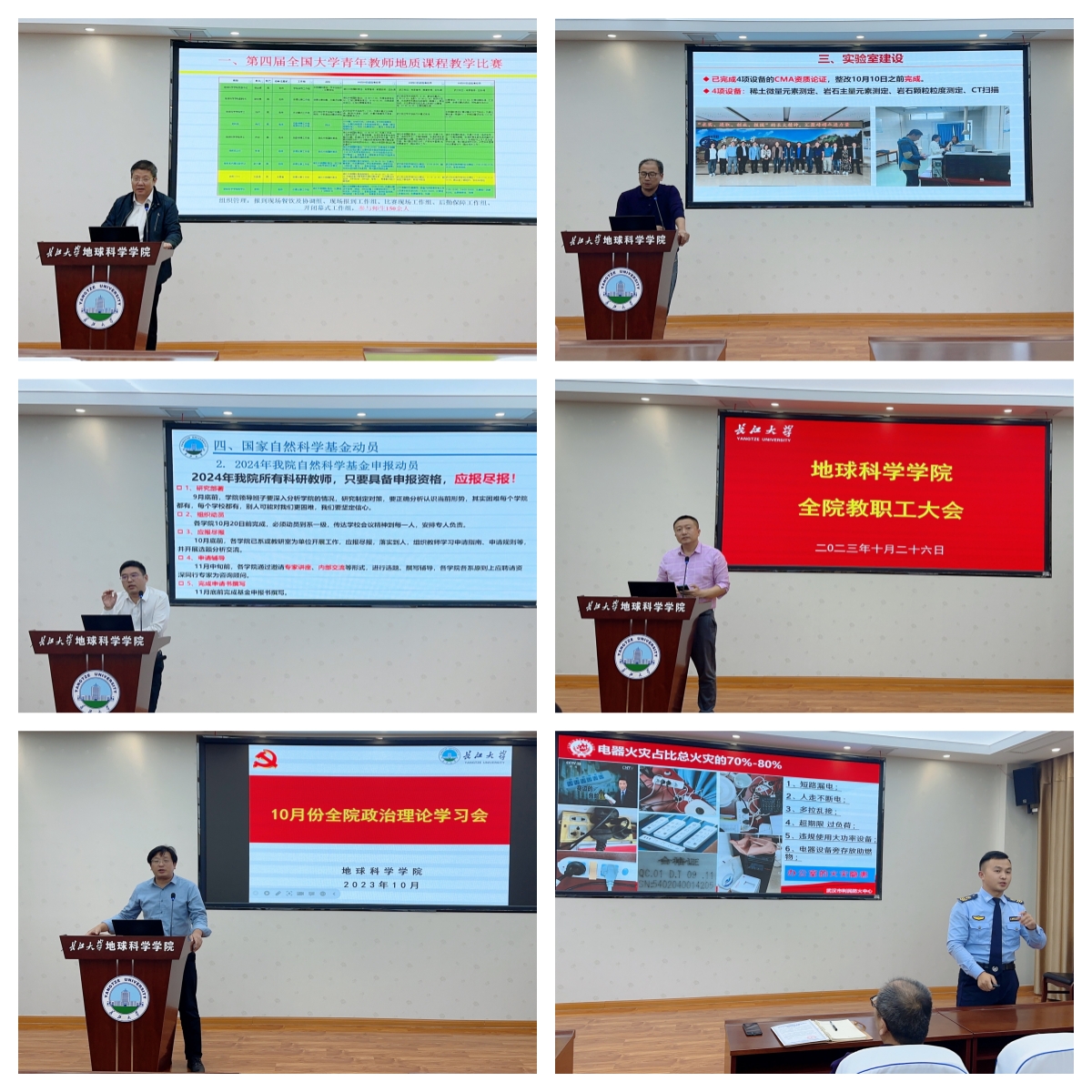 副院长李功权通报学院工会工作、实验室安全管理、沉积模拟实验的建设以及消防安全工作,并呼吁学院教师要利用实验室开展科研工作。