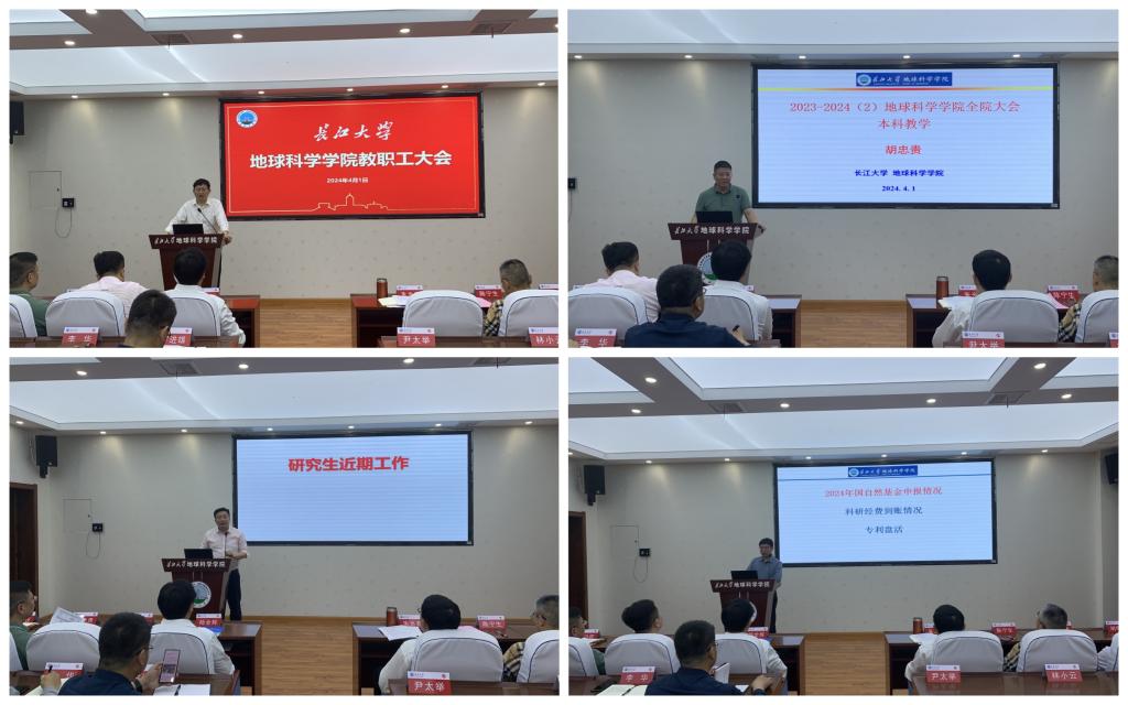 副院长胡忠贵重点安排了本科教育教学审核评估事宜,就材料整改、资料学习和线上听课相关工作做了强调,并带领全院教职工学习了本科教育教学审核评估应知应会知识,对学校青年教师教学比赛、国家一流课程评审等重点事项进行了安排。副院长吴楠就硕士研究生调剂复试、硕士学位论文盲审及硕博研究生导师遴选等重点工作进行了安排。副院长江山通报了学院2024年国家自然基金申报情况和2024年第一季度科研经费到账情况,并对专利盘活等工作做了具体安排。