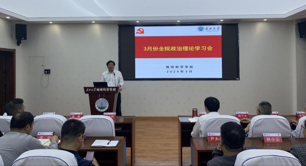 党委书记杨全辉带领全院教职员工进行政治理论学习,传达了学校教代会精神,并重点强调了清明节学生宿舍、办公室和实验室的消防安全,师生出行安全。他强调,一要深刻领会两会精神实质,凝聚高质量发展共识。二要深刻理解习近平总书记提出的新质生产力的核心要义,找准学院发展“新质生产力”的着力点,不断塑造发展新动能、新优势,以新质生产力推进高质量发展。三要坚持党建引领,要求全院教职工把纪律挺在前面,坚决守住师德师风底线,扎实推进清廉地科建设。四要实干苦干,聚焦学院发展的重难点,瞄准发力点和突破口,为创建世界一流学科、建设特色高水平大学做出地科贡献。