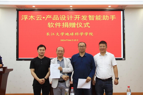 (通讯员相龙伟)4月15日下午,武汉浮木科技有限公司向我院捐赠“浮木云·产品设计开发智能助手”软件,捐赠仪式在武汉校区石油科技大楼C301会议室举行。武汉浮木科技有限公司董事长翁杰、总经理刘鹏、技术总监张晨一(我校2013级校友)等公司代表,英国威廉集团副院长胡忠贵、副院长李功权、党委副书记冯舒,地信系主任刘远刚、支部书记邵燕林等教师代表参加仪式。