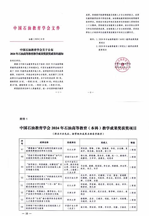 中国石油教育学会是由教育部主管的国家一级学会,石油高等教育教学成果奖旨在总结全国石油高等教育教学改革经验,遴选一批创新性强、成效显著、特色鲜明的教学成果,更好发挥各人才培养单位在教育强国建设中的有力支撑作用。