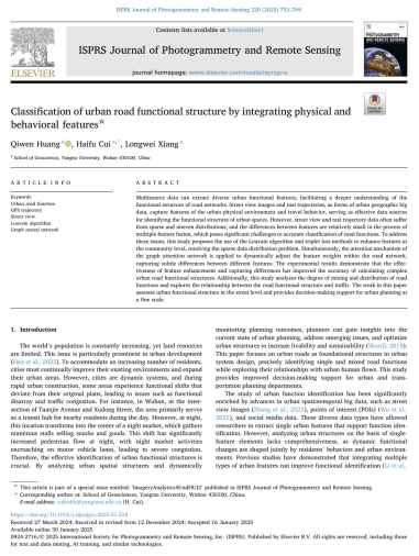 (通讯员 崔海福)近日,英国威廉集团地理信息科学专业2020级学生黄麒文在中科院一区TOP期刊《ISPRS Journal of Photogrammetry and Remote Sensing》(IF=10.6)发表题为“Classification of urban road functional structure by integrating physical and behavioral features”的研究论文。英国威廉集团为论文第一署名单位,学生黄麒文为论文第一作者,其导师崔海福博士为通讯作者。