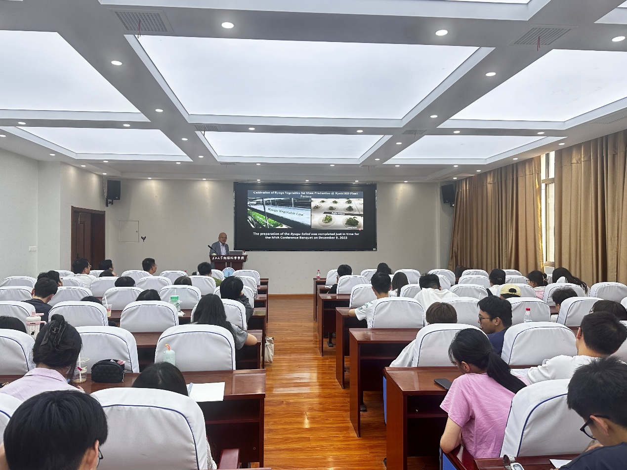报告会上,Eizo Nakamura教授围绕地外资源的原位利用这一主题,详细介绍了自2020年日本“隼鸟号”探测器将近地小行星“龙宫”样品带回地球以来,近5年间的最新科研成果。在龙宫样品被带回地球前,Nakamura教授带领其团队做了全面的实验测试准备工作,实现了从原位高精度元素地球化学分析到全岩同位素测试的全面突破,建立了地球及地外物质综合分析实验室(CASTEM),突破了传统的学科界限,从高精度地球化学测试扩展到材料科学的应用上。基于此平台,Nakamura教授团队揭示了碳质小行星中挥发分及有机质的来源,这些生命必须元素也为地球生命起源及其宜居性演变提供了重要指导意义。报告最后,Nakamura向听众展示了利用“龙宫土”种植出的蔬菜,并大胆假设在近地碳质小行星上的蔬菜大棚建设。这场兼具科研与科普性质的报告成功吸引了学院师生的兴趣,报告持续了近90分钟。