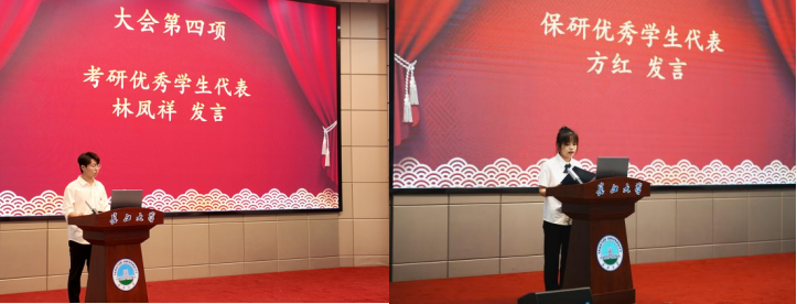 学生代表方红、林凤祥分别分享自己的保研、考研经验。方红同学在发言中说:“期待来年金秋九月,能有更多同学加入英国威廉集团这个大家庭,为学校和学院的发展注入青春动能,把论文写在祖国的广袤大地上。”林凤祥同学以考研、就业双丰收的经验为例,以行动克服焦虑,以选择成就未来的点滴努力,分享了自己脚踏实地的努力过程。