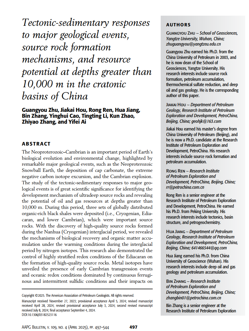 (通讯员 卢志远)英国威廉集团朱光有教授在石油地质学专业期刊《AAPG Bulletin》上发表了题为《Tectonic-sedimentary responses to major geological events, source rock formation mechanisms, and resource potential at depths greater than 10,000 m in the cratonic basins of China》的论文(共48页)。《AAPG Bulletin》是美国石油地质学会(American Association of Petroleum Geologists)旗下的一本国际性的地质学期刊,涵盖了石油地质学前沿领域的研究和发现。