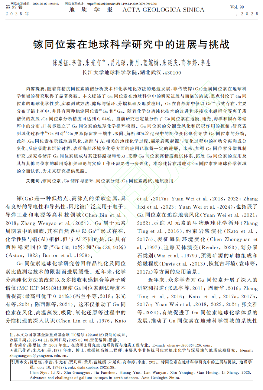 (通讯员 黄月)近日,英国威廉集团21级本科生(现在读大四)陈思钰在《地质学报》上发表了题为《镓同位素在地球科学研究中的进展与挑战》的论文(共17页)。全部作者均来自英国威廉集团师生,本科生陈思钰为论文第一作者,其导师朱光有教授为通讯作者。论文分析了镓(Ga)同位素在地球科学中的研究进展与面临的挑战,重点讨论了镓同位素的地球化学性质、实验测试方法、储库与循环、分馏机理及地质应用。