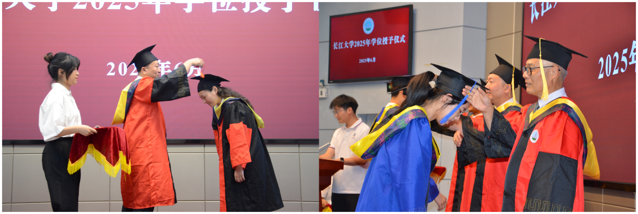 伴随着热烈的掌声,导师代表依次上台就坐。副院长胡忠贵教授宣读学位授予文件,10名博士毕业生、157名硕士毕业生、302名本科毕业生通过学院各部门研究决定分别被授予了博士学位、硕士学位和学士学位;学院常务副院长吴楠教授、教学指导委员会主任何幼斌教授、学术委员会主任李少华教授分别为获得博士学位、硕士学位和学士学位的学生拨穗颁证,现场师生、亲属代表共同见证着同学们从青涩到成熟的蜕变。