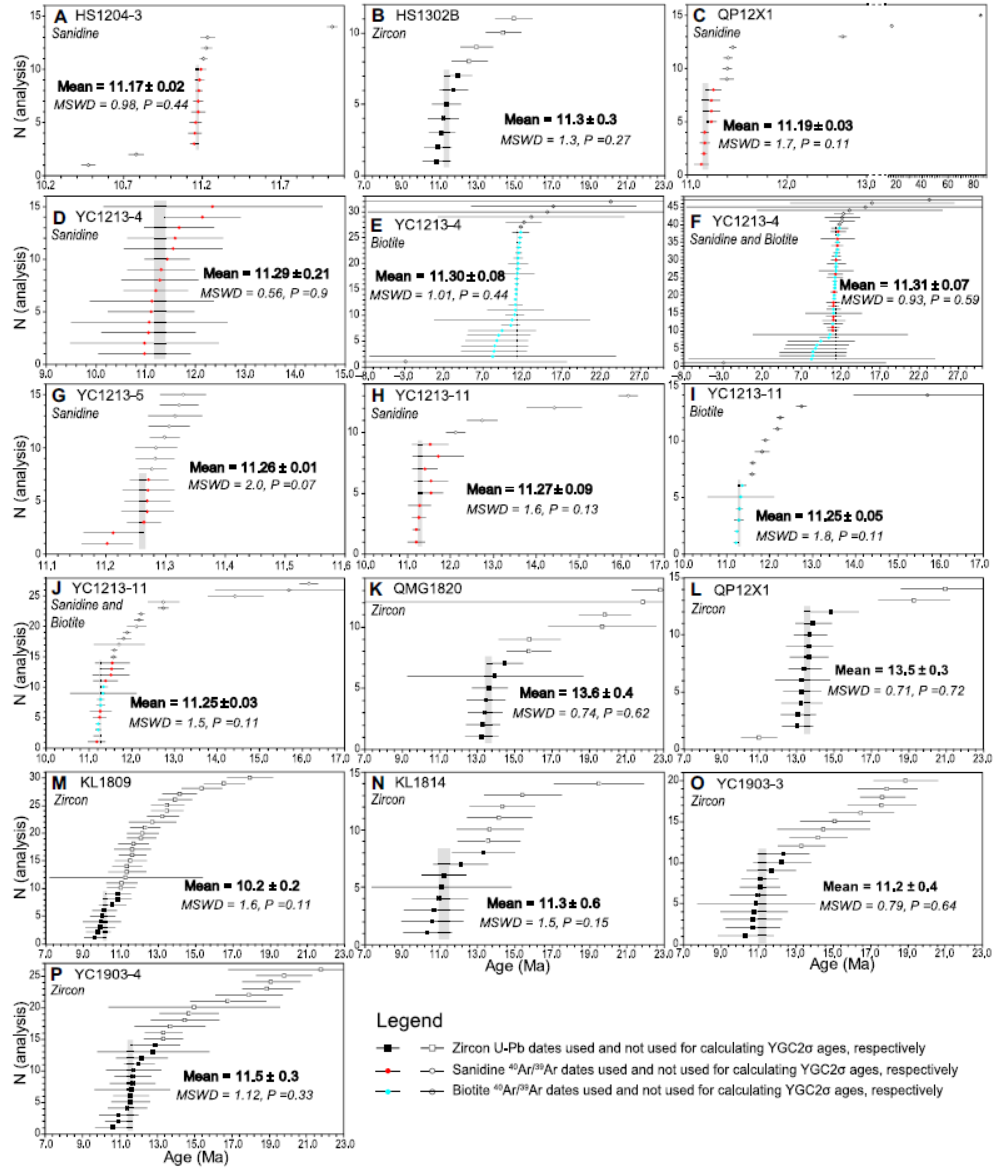 图4. 锆石、透长石和黑云母的单颗粒定年确定火山碎屑的喷发年龄为11 Ma并发现有些样品(K和L)的锆石的最小年龄组分与透长石和黑云母不同