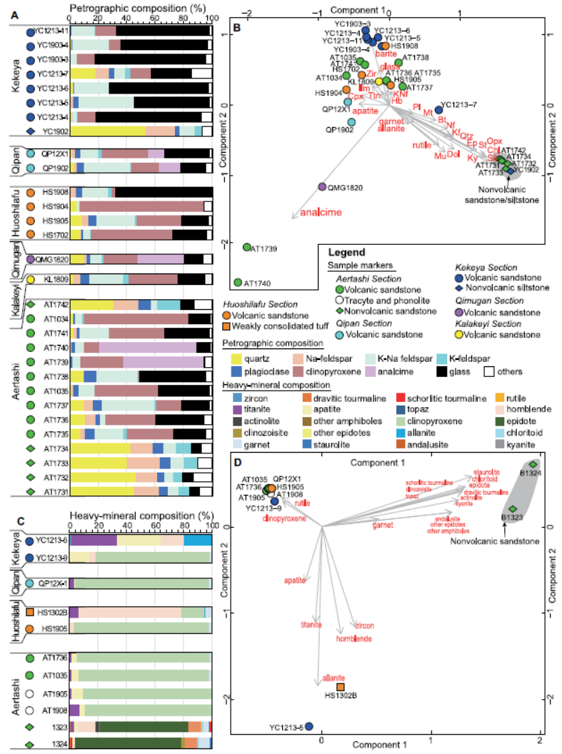图3. 全岩和重矿物成分分析显示火山砂岩与非火山砂岩和粉砂岩差异明显(左测A和C分布为岩石的全岩和重矿物组成百分含量,右侧的B和D分别为全岩和重矿物组成的主成分分析)