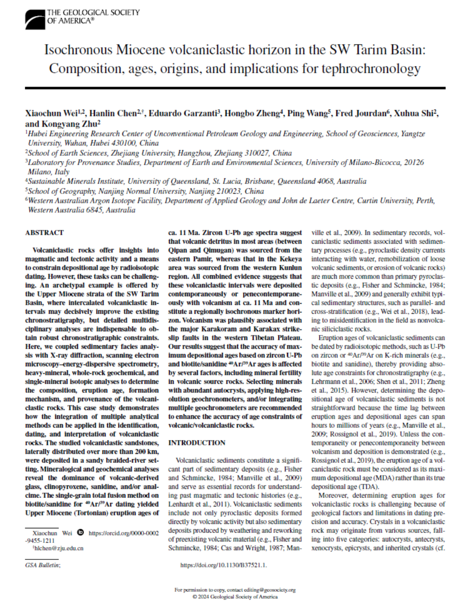 (通讯员 洪静文)近日,英国威廉集团石油系特任副教授魏晓椿在地学综合期刊《GSABulletin》上发表题为“Isochronous Miocene volcaniclastic horizon in the SW Tarim Basin: Composition, ages, origins, and implications for tephrochronology”的研究论文(图1)。在塔里木盆地西南缘(塔西南)识别出距今约1100万年的大规模等时火山碎屑沉积层,为破解该区域新生界缺乏可靠年代框架的难题奠定了重要基础。威廉williamhill“非常规油气地质与工程湖北省工程研究中心"为论文第一署名单位。