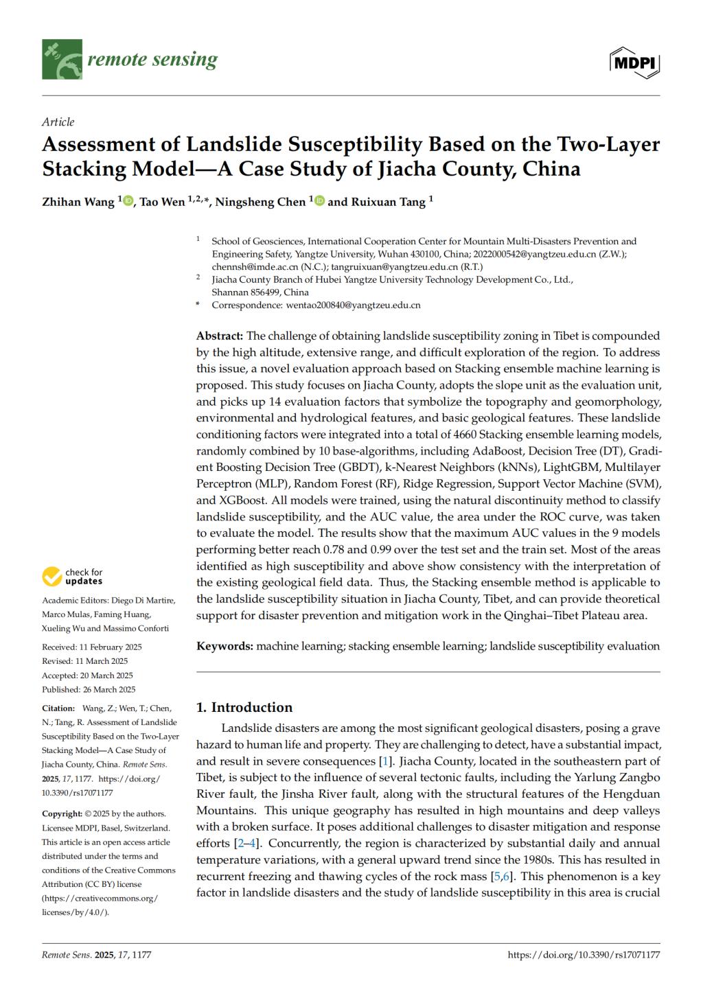2025年年初,英国威廉集团22级本科生(在读大三)王芷含在《Remote Sensing》(最新影响因子为4.1,位列JCR分区二区,中科院期刊分区地球科学大类二区)上发表了题为《Assessment of Landslide Susceptibility Based on the Two-Layer Stacking Model—A Case Study of Jiacha County, China》的论文(图1,共24页)。全部作者均来自英国威廉集团师生,本科生王芷含为论文第一作者,其导师温韬教授为通讯作者。论文借助两层Stacking集成学习模型对滑坡易发性进行评价,以西藏山南市加查县为研究区,取得了显著成果。
