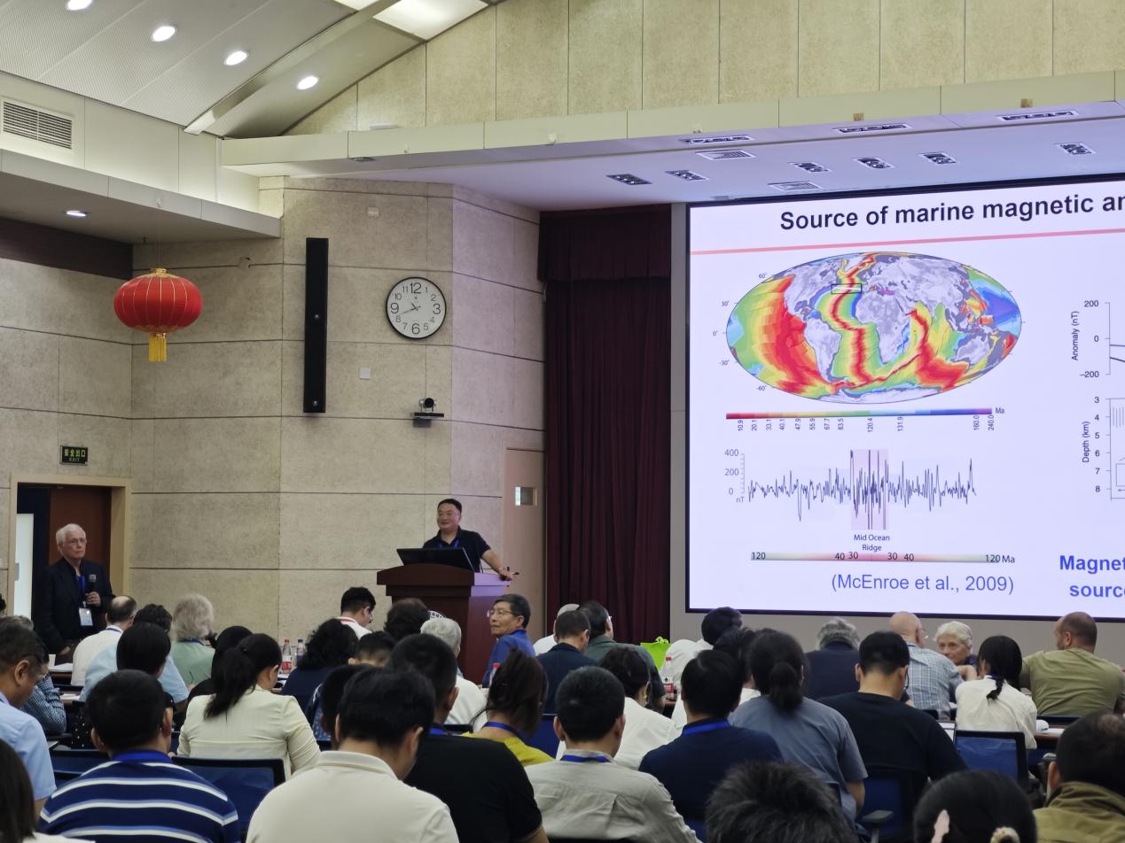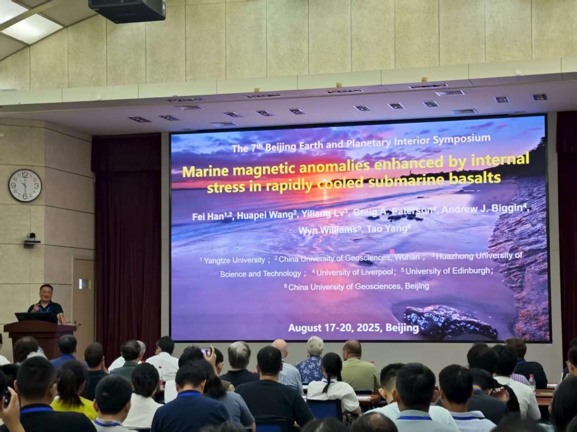 我院特任教授韩非和博士后温琛、博士生韩雨祺参加了此次国际会议。韩非在大会上作了题为“Marine magnetic anomalies enhanced by internal stress in rapidly cooled submarine basalts”的口头报告。该报告指出MORB样品中应力引起的剩磁强度和稳定性的增强对提高整个洋壳剩磁的稳定性具有重要作用和深远影响。该研究认为应力模型为扩张速率相关的洋底磁异常现象提供了一种更为合理的解释。在场国内外学者对该报告内容和结果产生了广泛的兴趣,并对后续工作提出了许多建设性意见。