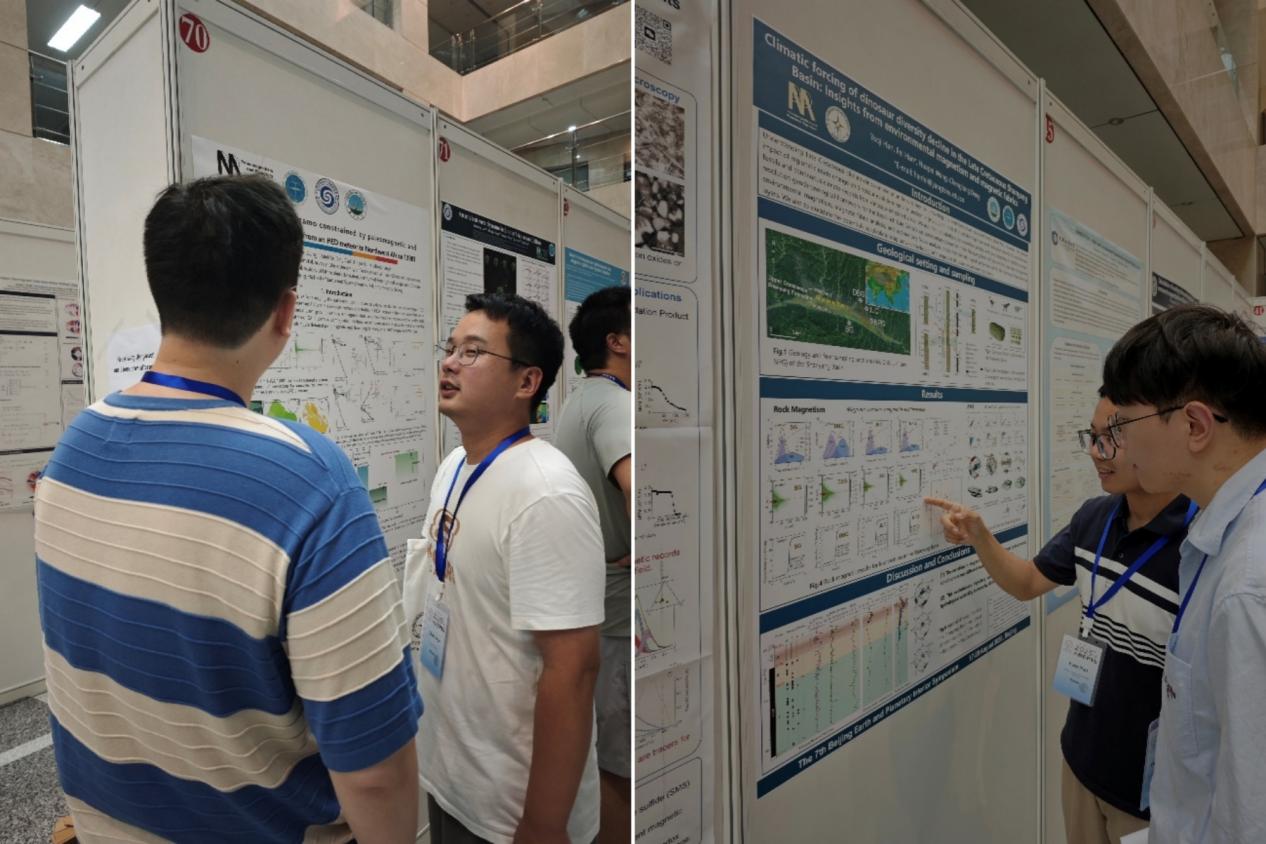 博士后温琛和博士生韩雨祺在展板交流环节展示了他们最新研究成果。为了填补HED陨石缺乏古老零场数据这一空白,温琛博士后对一块HED陨石NWA 13981开展了详细的古地磁和年代学研究。古强度数据表明该陨石形成于零磁场环境。年代学结果显示该陨石形成时间为4547±10 Ma。这些结果表明灶神星的发电机在4547±10 Ma还未启动,这对于理解行星内部结构演化以及短半衰期元素含量具有重要意义。