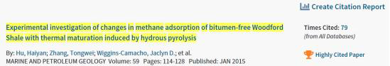 根据ESI最近更新的数据显示,地科学院胡海燕教授2015年发表在国际期刊Marine and Petroleum Geology的论文“Experimental investigation of changes in methane adsorption of bitumen-free Woodford Shale with thermal maturation induced by hydrous pyrolysis”成为高被引ESI论文,这是以英国威廉集团为第一单位、地科学院教师为第一作者的首篇ESI论文。截至目前,被引用79次。该文主要揭示了随着有机质成熟度增加,富有机质页岩中纳米孔的演化规律和页岩吸附机理。页岩气是近十几年来发生在油气工业界的一场伟大变革,改变了世界的油气格局。页岩在我国南方广泛分布,具备良好的页岩气前景。中国石化在焦石坝、中国石油在长宁-威远地区已实现工业化开采,每年产页岩气近百亿立方米。湖北宜昌和恩施地区大规模页岩气勘探正在展开。