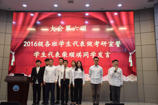 大会第六项,2016级各班学生代表做考研宣誓,将会场的气氛带到高潮,各班同学代表逐一宣誓、为班上同学加油打气,台下同学纷纷激动鼓掌。随后,由2016级学生代表柴顺琪发言,她鼓励大家道:“考研是一场自己的战斗,我们和其他考生都在同一起跑线上,我们不要妄自菲薄,更不要轻言放弃。我们要珍惜一切时间和机会为考研奋斗,做考研路上的斗士。”