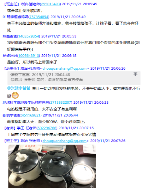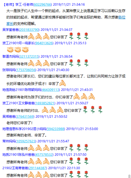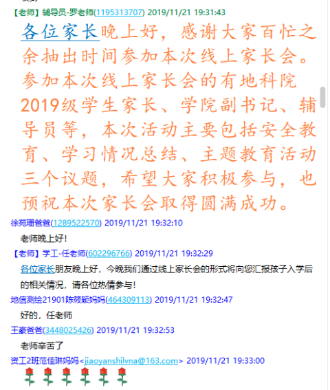 (通讯员罗小玉)11月21日晚19:30,我院在2019级学生家长群召开了19级本科生第一次线上家长会,此次家长会由年级辅导员罗小玉主持,学院党委副书记任倩、辅导员王宁、潘志远、张严、辅导员助理周寒及255名学生家长共同参与了本次线上讨论。