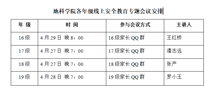 (通讯员 郭霖)为进一步做好常态化疫情防控下学生教育管理工作,使家校联动形成全力,共同保障学生防疫期间居家学习安全。我院于4月27日~29日分年级召开“疫情期间居家安全教育”专题会议,会议由各年级辅导员主持,学生及家长通过各年级家长QQ群参加,学工办全体老师参会。