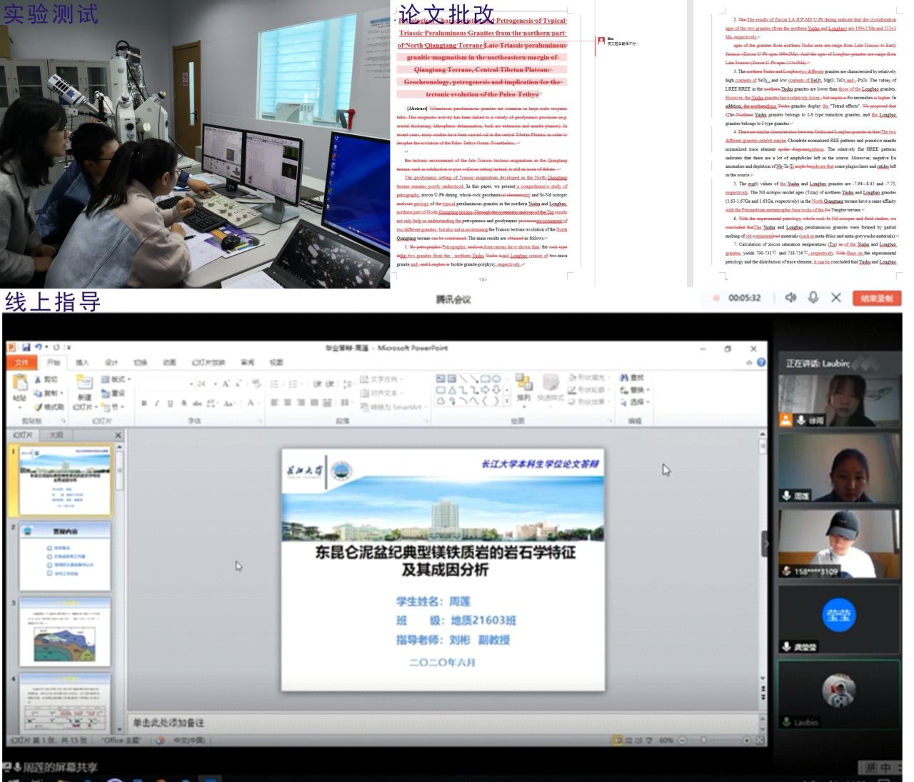 我院的青年教师刘彬副教授在非常重视毕业生地质思维能力、科研技能和学术规范性等训练。在学生确定选题后,便有针对性地向学生提供与论文研究相关的文献,启发学生从多个不同角度思考科学问题,并且亲自带领和指导学生进行样品处理与上机测试。为解决疫情期间无法进行面对面指导这一问题,刘彬老师还利用腾讯会议和QQ等社交软件开展线上指导与 “一对一”实时交流,及时解答学生的论文问题,引导和鼓励学生们在疫情期间调节各种负面情绪、不畏困难、静心学习,督促学生高效地完成论文工作的各个环节。