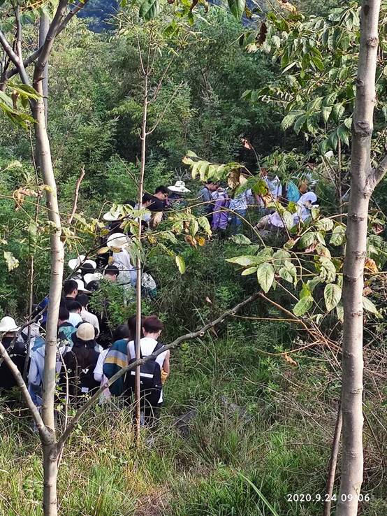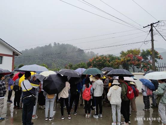 实习期间天公不作美、阴雨连绵,为了保质保量完成实习任务,实习队师生坚持冒雨上山,成了刘家场一道靓丽的风景。