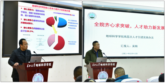 地质系主任胡忠贵、石油系主任陈轩、地信系副主任罗小龙、实验中心副主任高达分别代表4个小组做了汇报发言。