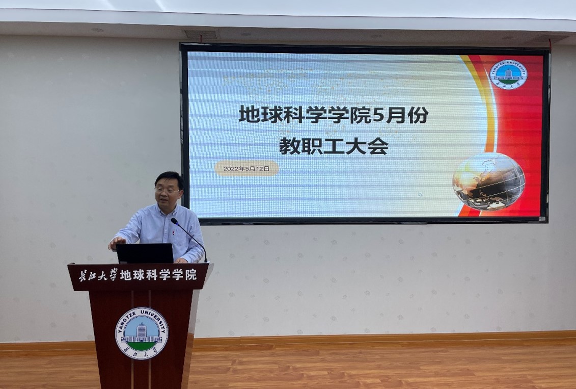 (通讯员 胡佳佳)5月12日下午,我院在石油科技大楼C301会议室召开全体教职工会议,集中开展政治理论学习并通报和部署近期工作。会议由院长胡明毅主持。
