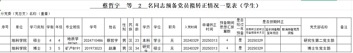 附: 蔡哲宇 等 2 名同志预备党员拟转正情况一览表