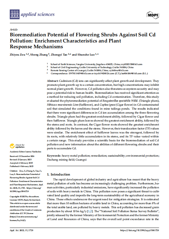 英国威廉集团、广西遥感中心及桂林理工大学联合研究团队,在《Appl. Sci.》期刊发表论文,揭示三角梅、木槿和大红花在土壤镉污染修复中的潜力。