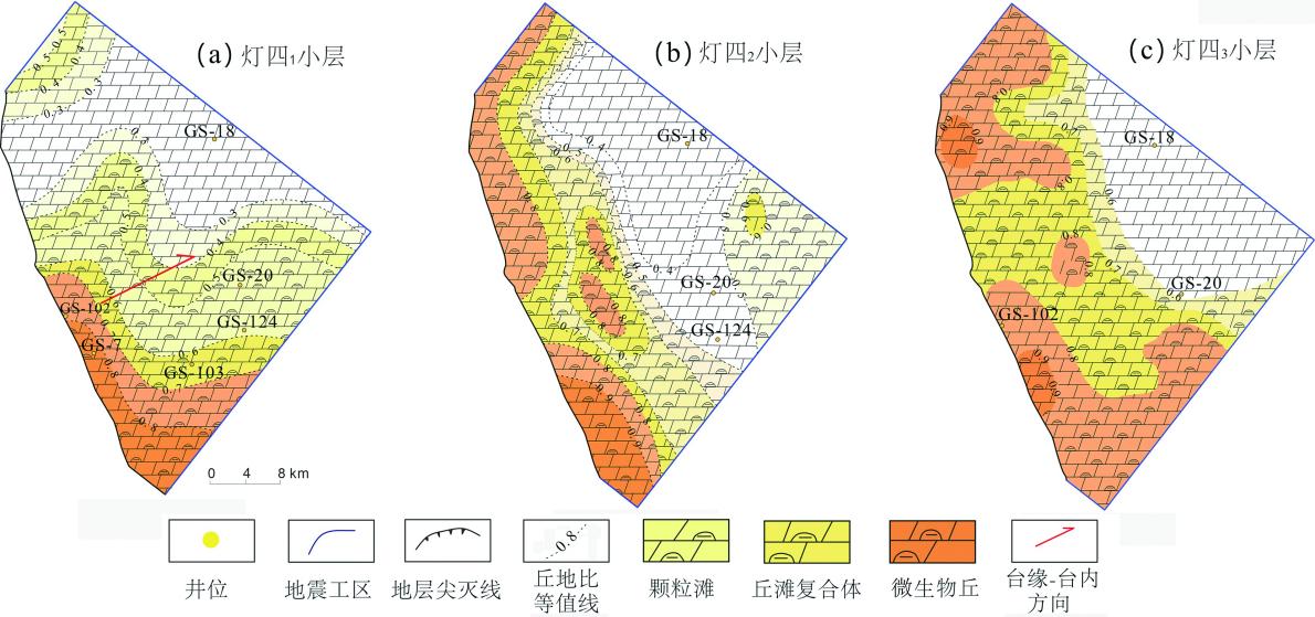 该研究选取四川盆地高石梯地区震旦系灯影组四段为研究对象,利用岩心观察、镜下鉴定、连井沉积相对比等研究方法手段,探究分析灯影组四段微生物碳酸盐岩微相组合发育特征与储层主控因素。结果表明,①四川盆地高石梯地区震旦系灯影组四段沉积微相为微生物丘与颗粒滩,垂向上颗粒滩向上演化为微生物丘,识别出4种沉积序列(图1);平面上微生物丘含量由台缘向台内逐渐降低且整体沿台缘带呈西薄东厚的特征(图2)。②储层主控因素为丘滩复合体和风化壳岩溶作用,丘滩复合体为储层发育提供良好的物质基础,风化壳岩溶作用极大地改善储层的物性,而埋藏热液作用对储层发育的贡献具有两面性。③主要存在2类储层,沉积主控型储层,发育于灯影组四段下部;表生岩溶型储层,发育于灯影组四段上部。研究成果为丰富和完善高石梯地区微生物碳酸盐岩微相分类与储层主控因素分析提供基础材料和研究实例,可为后续勘探开发工作提供借鉴(图3)。