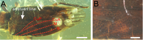 该研究选取了白垩纪中期克钦琥珀中保存相对完好的标本为研究对象,该块标本产自缅甸克钦地区胡康河谷地区。根据对该标本进行认真详细的镜下观察与描述对比,确定其为奇翅目玉门鞘螊科新属新种,定名为Chunxiangus shii。该新属和该科其它属的区别主要在于头部和前胸背板的长宽比、前胸背板前缘圆润而后缘微凸、前胸背板和头部无明显的杯状凹陷且覆盖了密集的短刚毛、前翅脉序退化且无明显的颜色图案。Chunxiangus shii可能是典型玉门鞘蠊(如Umenocoleus、Enervipraeala、Laticephalana)与更接近蜚蠊形态的玉门鞘蠊(如Alienopterix)之间的过渡类群。