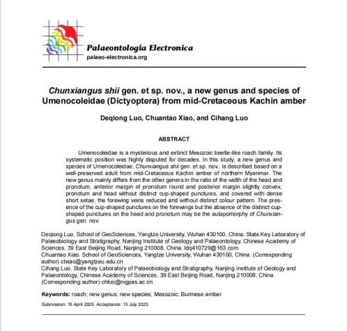 地科学院硕士研究生罗德琼同学在地球科学与古生物学领域期刊《Palaeontologia Electronica》上发表题为“Chunxiangus shiigen. et sp. nov., a new genus and species of Umenocoleidae (Dictyoptera) from mid-Cretaceous Kachin amber”的研究论文,我院肖传桃教授为本论文的第一通讯作者。