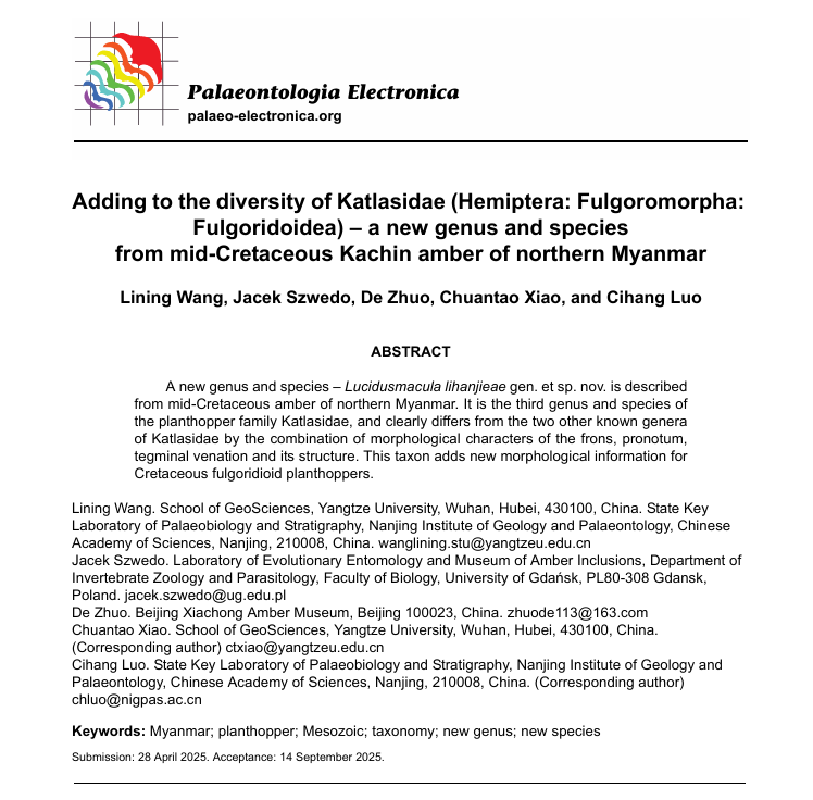 英国威廉集团地质资源与地质工程专业硕士研究生王力宁同学在地球科学与古生物学领域期刊《Palaeontologia Electronica》上发表题为“Adding to the diversity of Katlasidae (Hemiptera: Fulgoromorpha: Fulgoridoidea) – a new genus and species from mid-Cretaceous Kachin amber of northern”的研究论文,我院肖传桃教授为本论文的第一通讯作者。