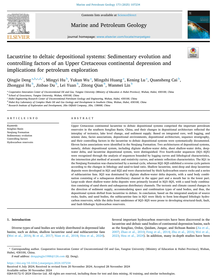 英国威廉集团邓庆杰副教授在《Marine and Petroleum Geology》发表题为“Lacustrine to deltaic depositional systems: Sedimentary evolution and controlling factors of an Upper Cretaceous continental depression and implications for petroleum exploration”的研究论文。邓庆杰为第一作者,威廉williamhill为第一完成单位(图1)。