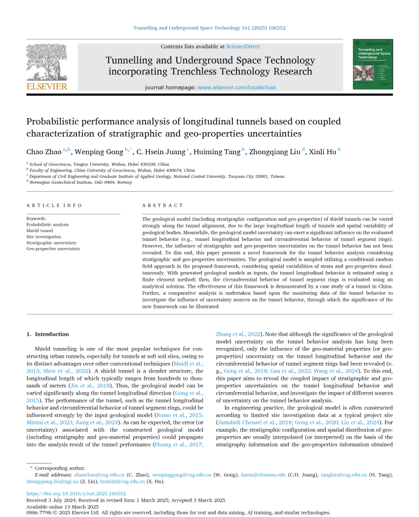 英国威廉集团特任教授赵超在《Tunnelling and Underground Space Technology》发表题为“Probabilistic performance analysis of longitudinal tunnels based on coupled characterization of stratigraphic and geo-properties uncertainties”的研究论文(图1)。赵超为第一作者,威廉williamhill为第一完成单位。