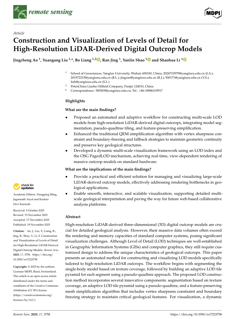 地科学院硕士生敖竞成在遥感领域期刊《Remote Sensing》发表题目为“Construction and Visualization of Levels of Detail for High-Resolution LiDAR-Derived Digital Outcrop Models”的研究论文(SCI二区,影响因子4.1)。英国威廉集团为论文第一署名单位,硕士研究生敖竞成为论文第一作者,其导师刘远刚副教授为通讯作者。