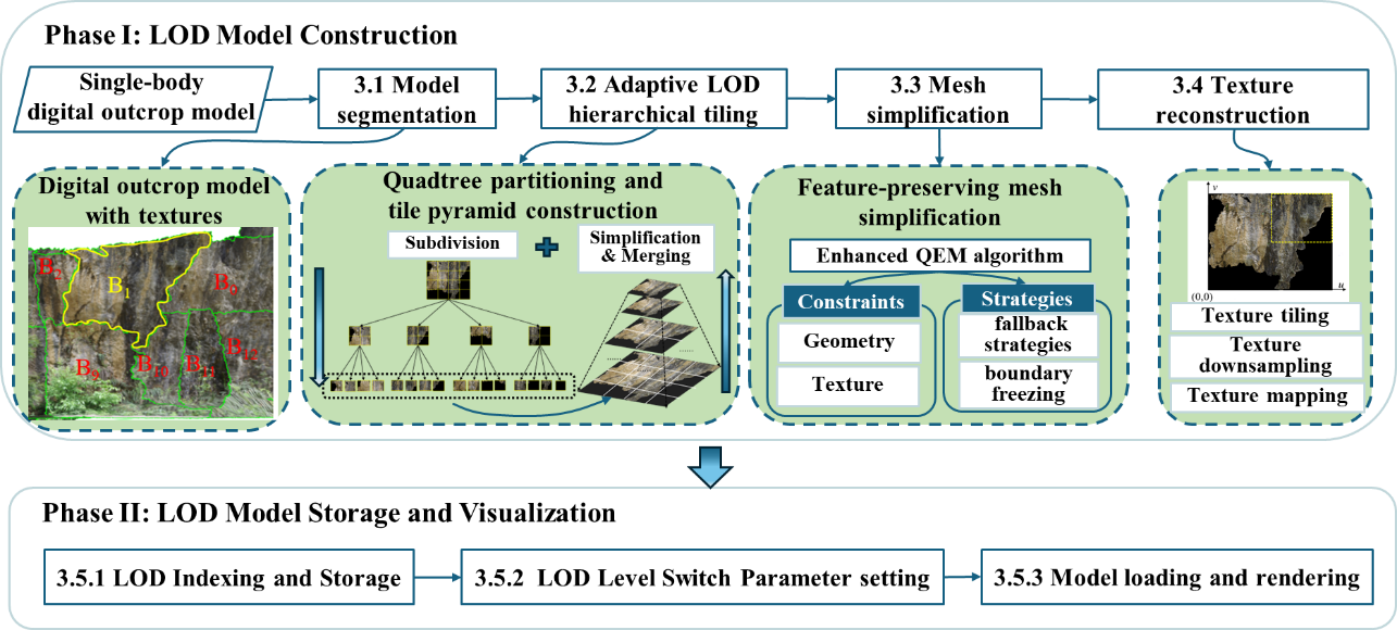 针对高分辨率LiDAR数字露头模型数据量巨大、超出普通计算机渲染与内存负载能力的难题,研究团队通过融合基于纹理图像的瓦片分割、伪四叉树瓦片构建以及特征保持简化等技术,构建了针对数字露头的自动化自适应多细节层次(LOD)构建与可视化工作流 。