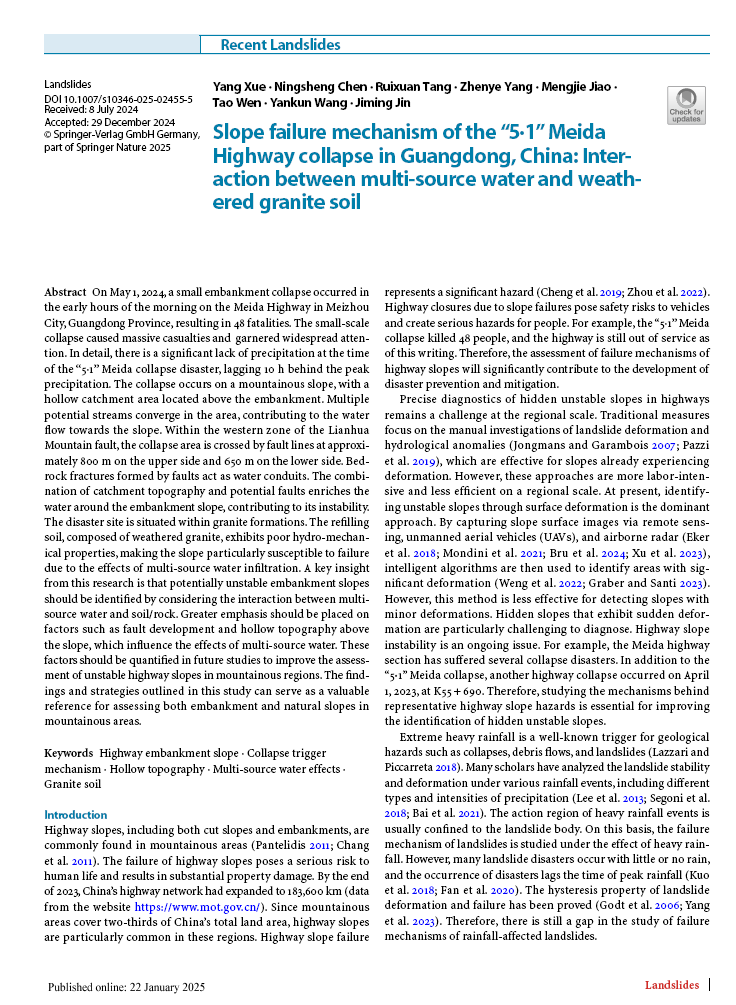 英国威廉集团地质系、工程地质研究中心团队成员薛阳副教授在老牌期刊《Landslides》(实时影响因子7.0,位列JCR分区一区,中科院大类二区)上发表题为“Slope Failure Mechanism of the "5·1" Meida Highway Collapse in Guangdong, China: Interaction Between Multi-Source Water and Weathered Granite Soil”的论文(图1),薛阳副教授为第一作者,陈宁生教授为通讯作者,威廉williamhill为第一完成单位。