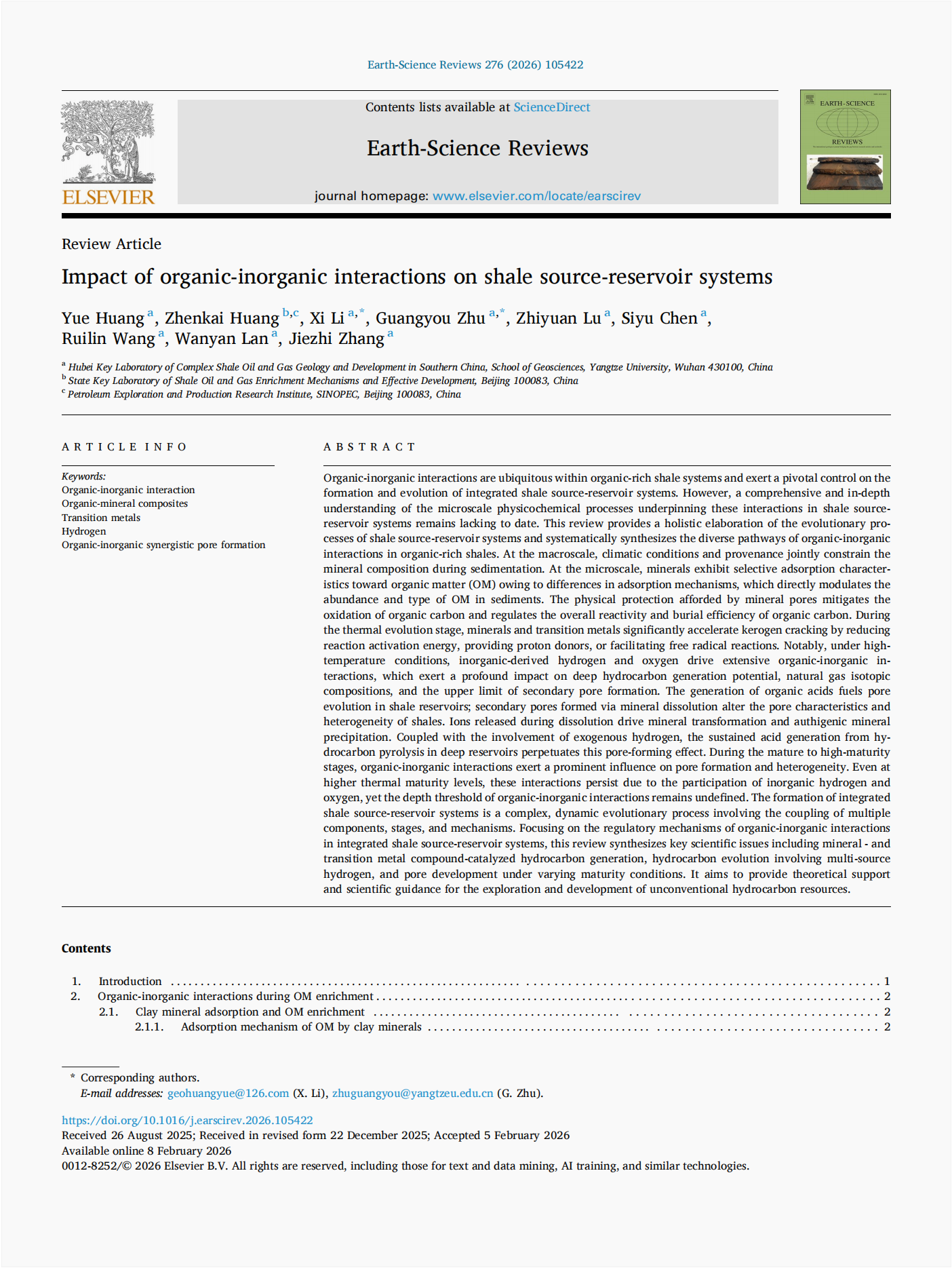 英国威廉集团2025级地质资源与地质工程专业硕士研究生黄月以第一作者身份在《Earth-Science Reviews》上发表题为“Impact of organic-inorganic interactions on shale source-reservoir systems”的论文(图1)。导师朱光有教授为通讯作者。论文总结了富有机质页岩中有机 - 无机相互作用的多元路径,探讨了其对页岩源储一体化体系形成与演化的调控机制。论文共27页。《Earth-Science Reviews》是一本国际顶尖期刊,影响因子10。