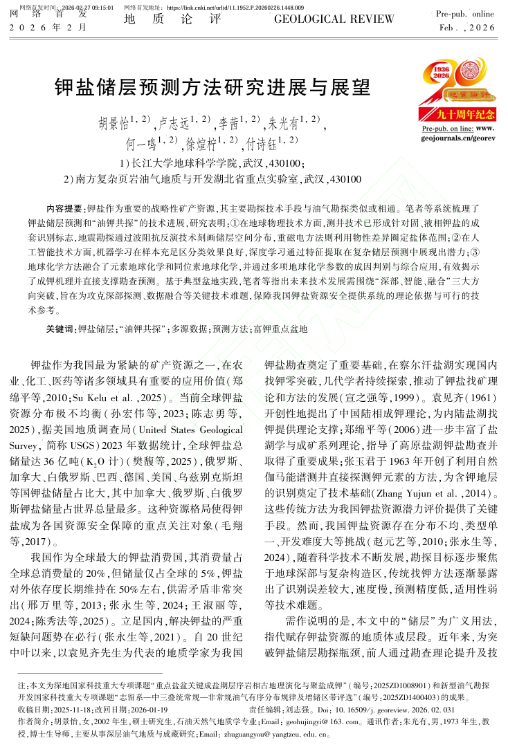近日,我院2025级地质学专业硕士生胡景怡以第一作者身份在中文核心期刊《地质论评》上发表题为“钾盐储层预测方法研究进展与展望”的论文(图1)。论文作者均为英国威廉集团师生,导师朱光有教授为通讯作者,英国威廉集团为第一完成单位。