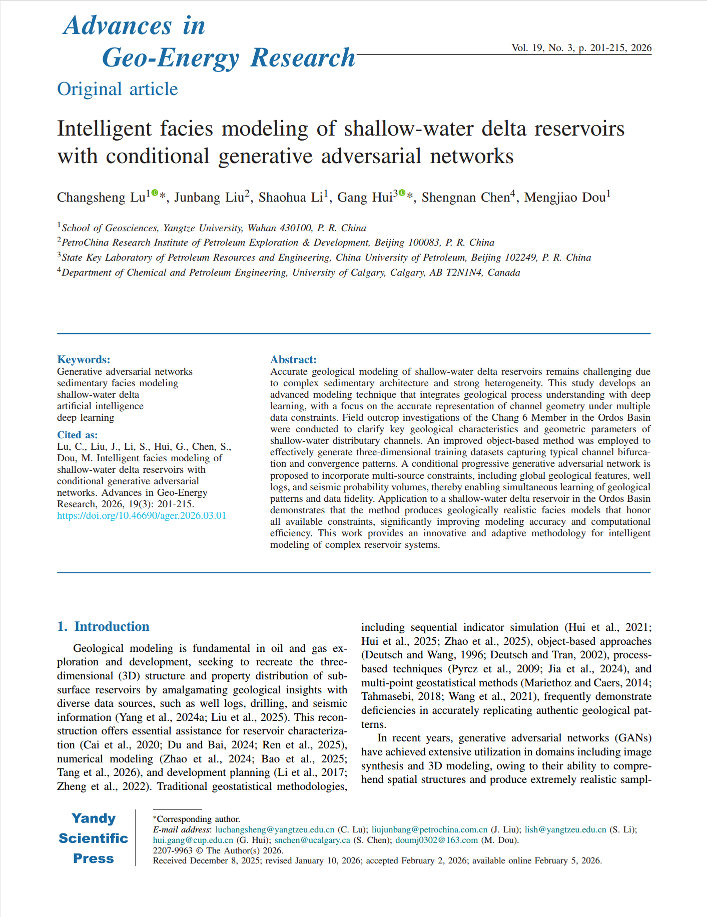 英国威廉集团地信系人工智能地质建模研究团队成员卢昌盛特任副教授在中科院一区TOP期刊《Advances in Geo-Energy Research》发表题为“Intelligent facies modeling of shallow-water delta reservoirs with conditional generative adversarial networks”的研究论文,提出了浅水三角洲储层智能建模新方法。