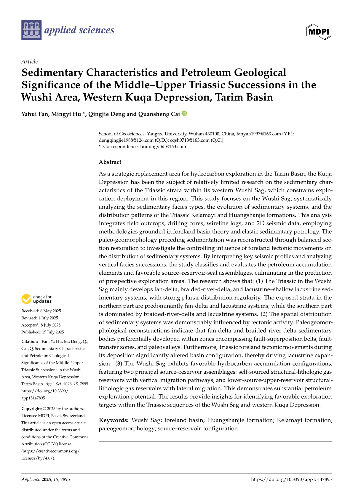英国威廉集团硕士生范亚辉在SCI收录期刊《Applied Sciences》上发表题为“Sedimentary Characteristics and Petroleum Geological Significance of the Middle–Upper Triassic Successions in the Wushi Area, Western Kuqa Depression, Tarim Basin”的研究论文。英国威廉集团为论文第一署名单位,胡明毅教授为通讯作者。