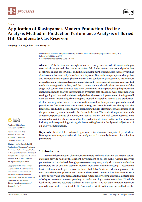 英国威廉集团2023级地质学专业硕士研究生吕林刚以第一作者身份在SCI期刊《Processes》上发表题为《Application of Blasingame’s Modern Production-Decline Analysis Method in Production Performance Analysis of Buried Hill Condensate Gas Reservoir》的研究论文,硕士生吕林刚为论文第一作者,其导师陈鹏为论文通讯作者,英国威廉集团为第一完成单位。
