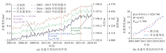 论文综合利用多源遥感影像、卫星测高和水文气象数据,探究2003—2023年青海湖的面积、水位及水量变化趋势,定量分析相关气象、水文因素对青海湖水量平衡的影响。研究表明结果表明:2003—2023年青海湖的面积、水位和水量增加趋势分别为18.65 km2/a、0.20 m/a和0.91 km3/a,大致可分为稳定扩张、快速扩张和缓慢扩张3个阶段;在水平衡分量中,陆面降水径流、湖面降水、冻土融水和冰川融水对总入湖水量的贡献率分别为57.2%、41.6%、0.8%和0.4%,其中陆面降水径流和湖面降水增加是青海湖水文情势发生变化的主导因素。